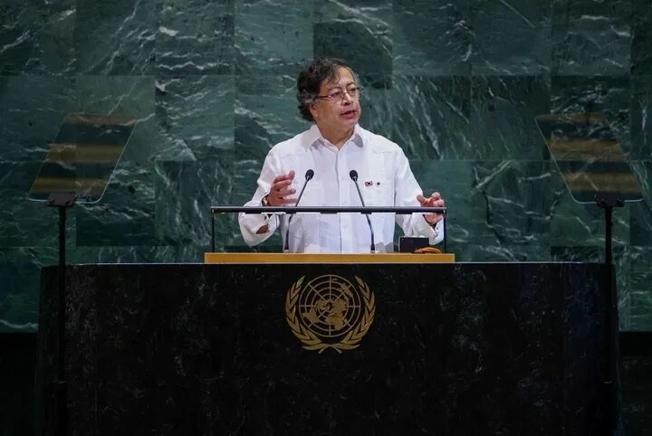 9月23日,哥伦比亚总统古斯塔沃·佩特罗在纽约联合国总部举行的联合国大会一般性辩论中发表讲话。新华社/法新